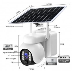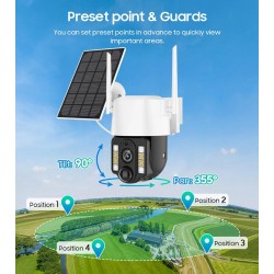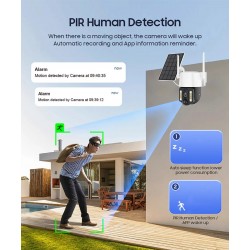 Diese 4K 8MP Solarkamera mit 12000mAh Akku und IP66-Wasserdichtigkeit bietet eine hervorragende Sicherheitslösung. Sie verfügt über Auto-Tracking, Personenerkennung, Zwei-Wege-Audio und Nachtsicht mit 6 IR-LEDs und 4 weißen LEDs. Die Kamera unterstützt 4G-SIM-Karten, 128 GB Speicherkarten und lässt sich über die V380 PRO App fernsteuern. Darüber hinaus verfügt sie über eine 4-fach-Zoomfunktion und die Möglichkeit, den Erfassungsbereich und die Empfindlichkeit zu konfigurieren.