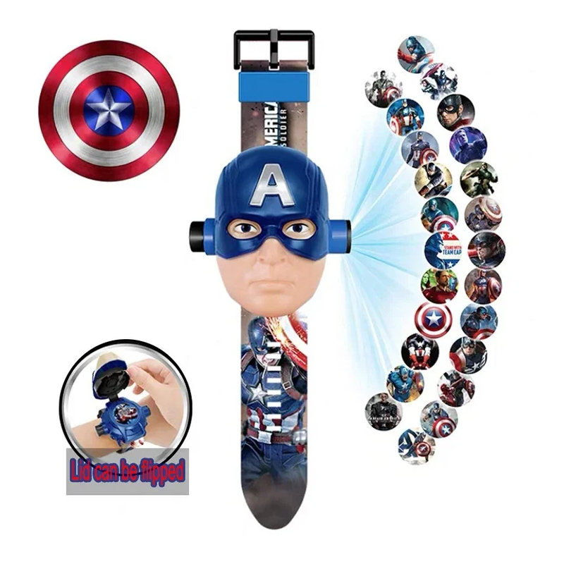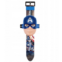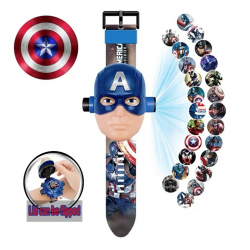 Tolle Kinderuhr mit Projektor! Der Projektor zeigt bis zu 24 Bilder mit Charakteren aus dem berühmten Film „Captain America“. Um die Bilder anzusehen, halten Sie den Knopf an der Seite der Uhr gedrückt und stellen Sie das Bild anschließend mit dem Drehknopf ein. Die Uhr ist ideal für Fans des beliebten Cartoons.