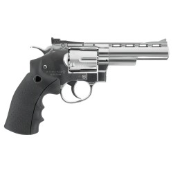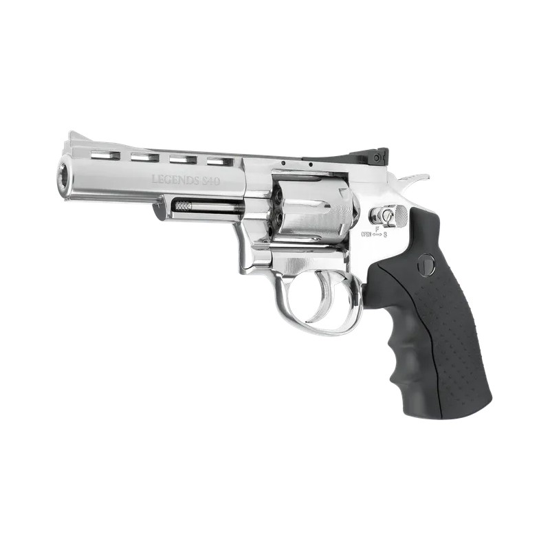Ein wirklich hochwertiger Revolver, ganz aus Metall, mit glänzend vernickelter Oberfläche: Die drei Modelle der Legends-Serie – S25 (2,5 Zoll), S40 (4 Zoll) und S60 (6 Zoll) – unterscheiden sich lediglich in der Länge das Fass. Für die Authentizität verfügen sie über sechs Metallpatronen für einen Schuss und einen gezogenen Lauf für präzises Schießen. Die Kimme ist verstellbar und die Laufsperre dient als Sicherung, wenn sie auf die gegenüberliegende Seite geschoben wird.