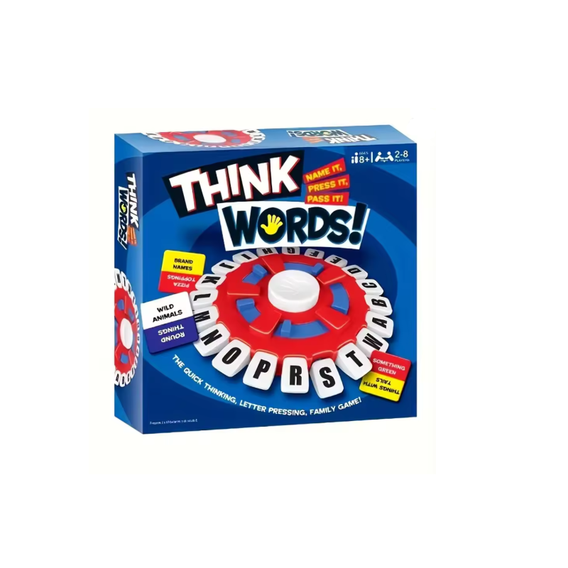 Das Brettspiel THINK WORDS basiert auf dem Tapple -Prinzip und fördert schnelles Denken und Reaktionsvermögen für die ganze Familie und Freundesgruppen. Es regt Kreativität, assoziatives Denken und schnelle Reaktionen an und ist daher ideal für Partys, Ausflüge oder einfach zum Entspannen. Ziel des Spiels ist es, innerhalb kurzer Zeit und unter Zeitdruck ein Wort zu finden, das mit einem bestimmten Buchstaben beginnt und zu einem vorgegebenen Thema passt.