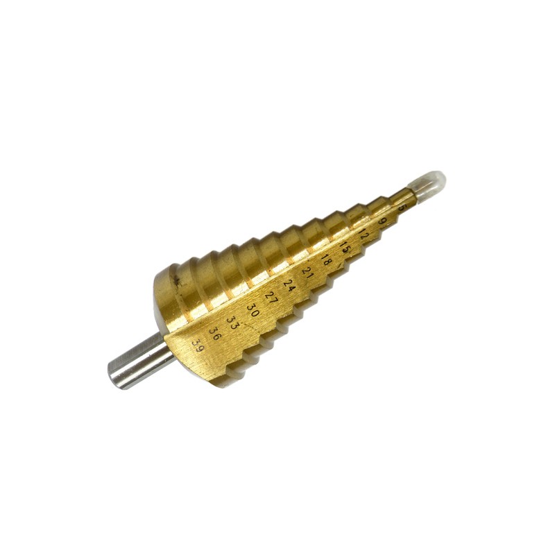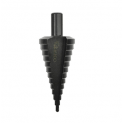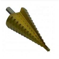 HSS-Titan-Stufenbohrer mit Bohrdurchmessern von 4 bis 32 mm. Konzipiert zum Bohren von Nichteisenmetallen, Stahlblechen und Kunststoffen.