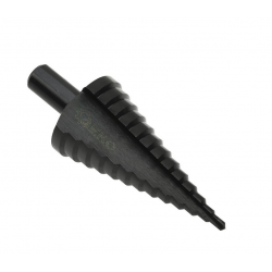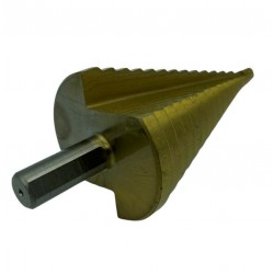 HSS-Titan-Stufenbohrer mit Bohrdurchmessern von 4 bis 39 mm. Konzipiert zum Bohren von Nichteisenmetallen, Stahlblechen und Kunststoffen.