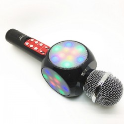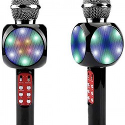 Karaoke-Mikrofon WS-1816 . Dieses Mikrofon eignet sich ideal zum Karaoke-Singen. Es lässt sich über ein Audiokabel mit verschiedenen Geräten verbinden und gibt Musik über den integrierten, leistungsstarken Lautsprecher wieder. Dank des FM-Moduls können Sie Ihre Lieblingsradiosender hören und mit der Fernbedienungstaste Fotos mit Ihrem Smartphone aufnehmen. Das Mikrofon verfügt über Bluetooth, sodass Sie es mit verschiedenen Bluetooth-fähigen Geräten (Smartphones, Tablets, Computern) verbinden und Musik darüber abspielen können. Das Gerät ist mit einer LED-Beleuchtung ausgestattet.