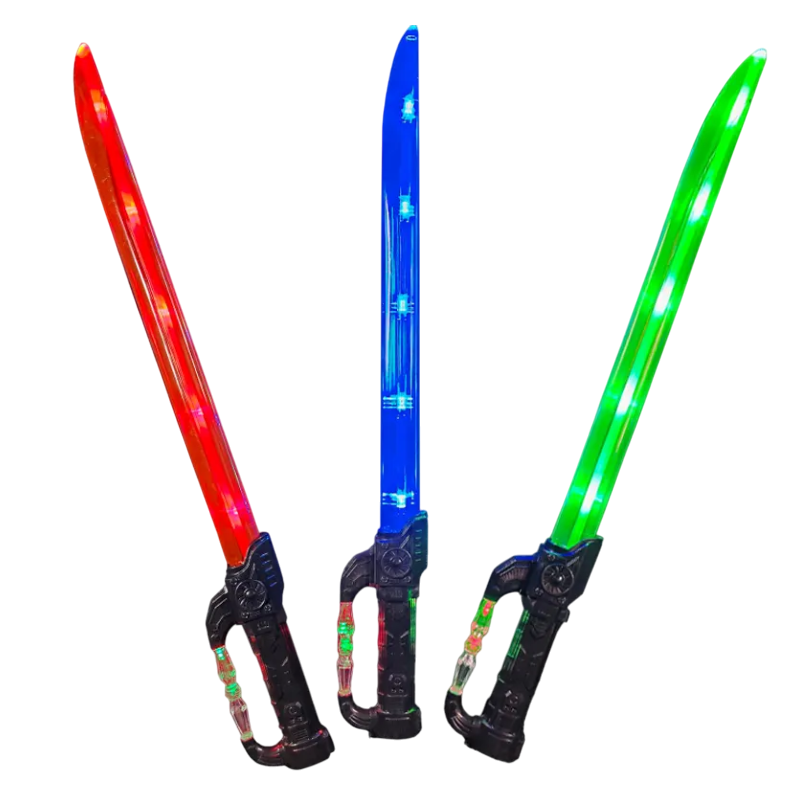 Das 64 cm lange, farbenfrohe, leuchtende und geräuschvolle Schwert wird jeden Kämpfer begeistern.