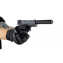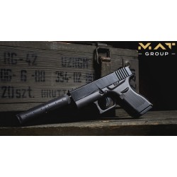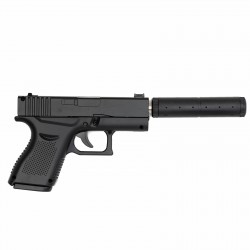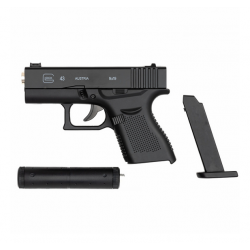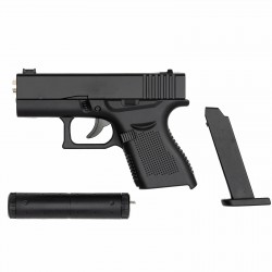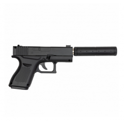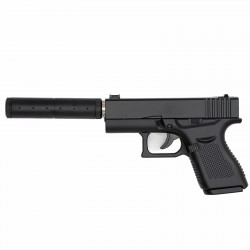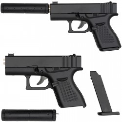 Hochwertige, metallisierte Pistole mit Schalldämpfer, die 6-mm-Kunststoffkugeln verschießt.