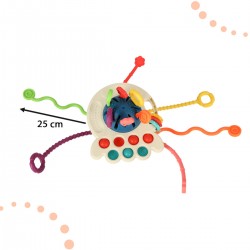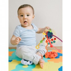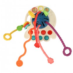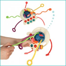 Zunächst einmal fördert dieses Spielzeug die Feinmotorik, denn die vielen manuellen Aktionen, die beim Spielen damit nötig sind, trainieren Fingerfertigkeit und Hand-Augen-Koordination. Darüber hinaus wirkt sich dieser ungewöhnliche Beißring positiv auf andere Bereiche aus, wie etwa Selbstständigkeit, Konzentration und spontane Handlungen, die das Verständnis der Welt verbessern. Man kann überall damit spielen – zu Hause, im Auto oder im Kinderwagen. Jeder Moment ist perfekt für ein bisschen Spielspaß!