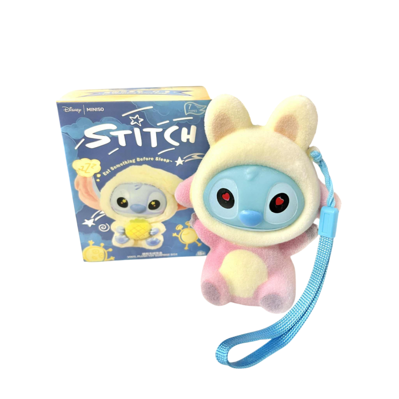 Die Verpackung ist eine Überraschung. Darin befindet sich eines von sieben weichen Stitch-Spielzeugen.