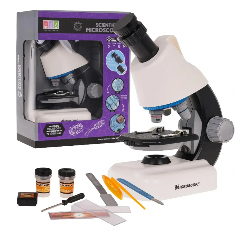Das Lernmikroskop-Set fördert die wissenschaftliche Neugier und führt auf interessante Weise in die Welt der Wissenschaft ein. Dank des Objektivs lässt sich die Vergrößerung einstellen; mit diesem Mikroskop können Sie verschiedene Objekte 100-, 400- und 1200-fach vergrößern. Das Mikroskop verfügt über einen drehbaren Kopf und zwei Lichtquellen (obere und untere LED-Lichtquellen), sodass Sie sowohl transparente als auch opake Proben betrachten können.