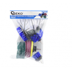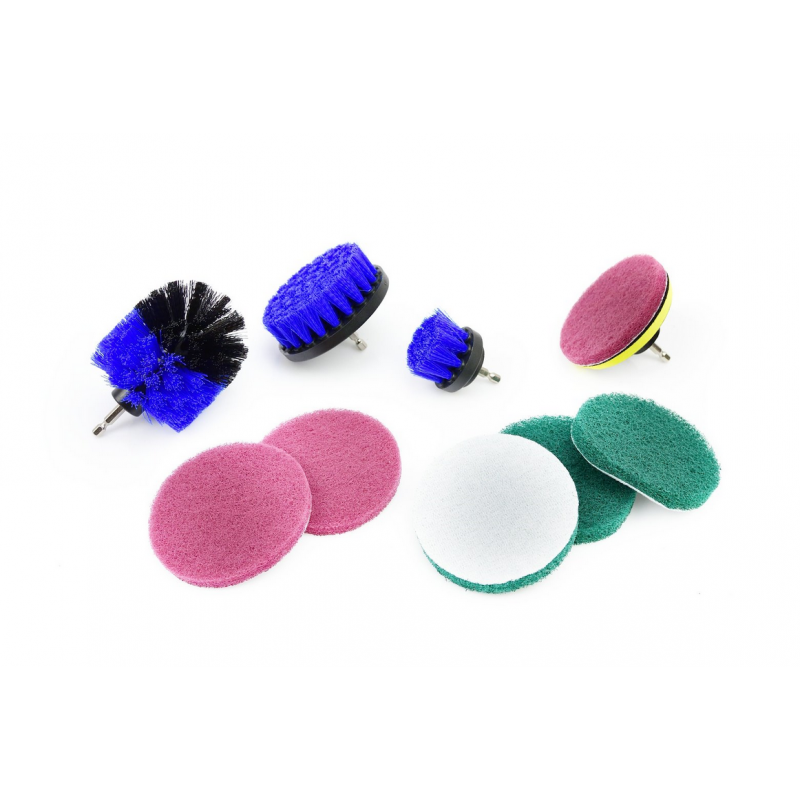Im Set enthalten sind: 3 Nylonbürsten 50 mm, 100 mm und 85 mm (Rundbürste), 3 mittelharte Scheiben, 3 mittelweiche Scheiben und ein 75 mm Adapter mit 1/4 Zoll Schaft.