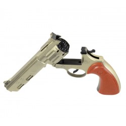 Funktionsprinzip: Das rote Magazin wird in die Trommel eingeführt. Beim Betätigen des Abzugs ist ein Schuss zu hören und Rauch entsteht. Durch Gedrückthalten des Abzugs können bis zu acht Schüsse abgegeben werden.