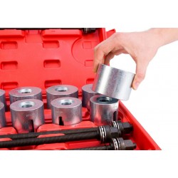 Dieser professionelle Lagerabziehersatz mit 5 Achsen und Muttern eignet sich perfekt zum Aus- und Einbau von Buchsen, Lagern und Dichtungen. Der Satz ist universell einsetzbar, passend für LGV- oder HGV-Fahrzeuge. Die Werkzeuge eignen sich für Silentlager, Hydrauliklager, Lagerbuchsen, Kugellager, Wellendichtringe, Gummilager etc. Kompatibel mit Werkstattpressen.