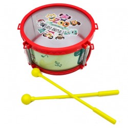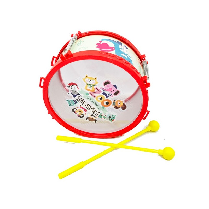Lustiges Kinderspielzeug: Trommel mit Stöcken. Verziert mit bunten Tierbildern.